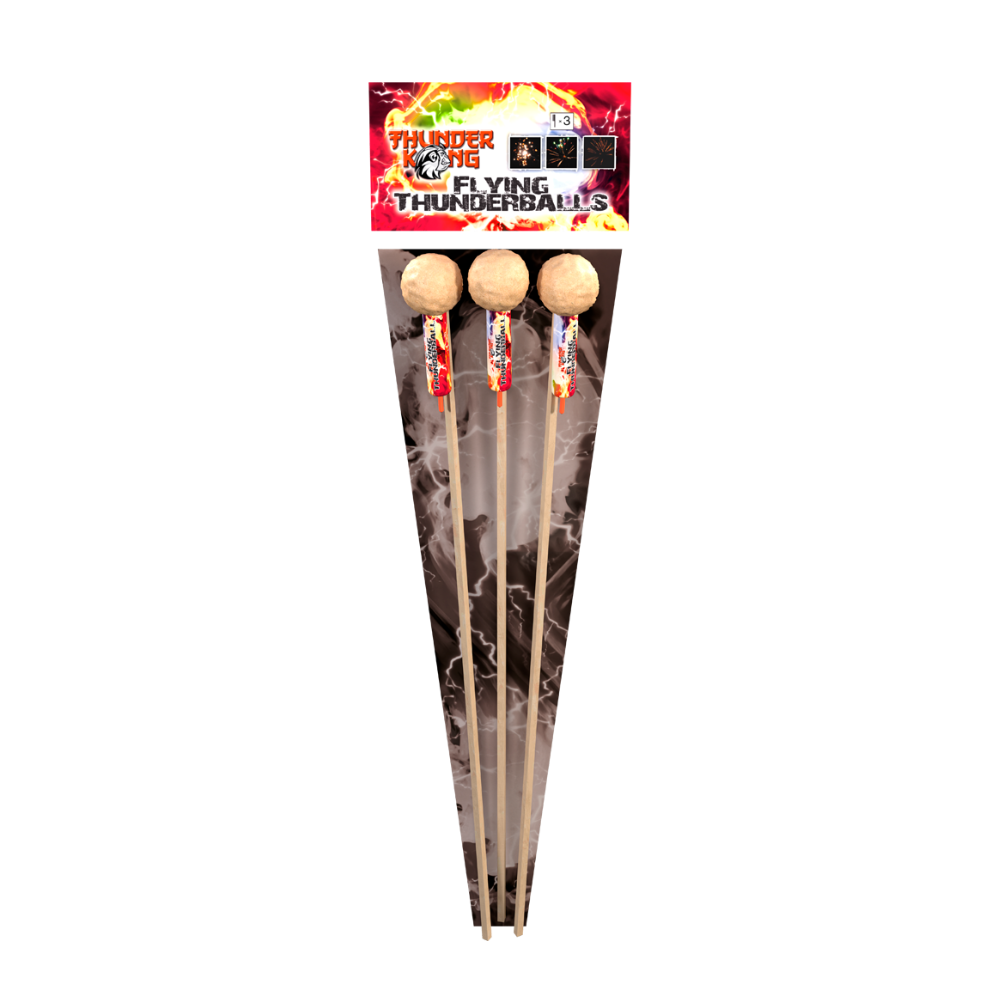Die Thunder Kong Flying Thunderballs bieten drei beeindruckende Kugelbomben-Raketen mit kräftigem Burst und spektakulären Effekten. Jede Rakete überzeugt durch ihre eigene Charakteristik – von einer leuchtenden Crown, über eine goldene Coco, bis hin zu intensiven Crackling-Strobe-Effekten.