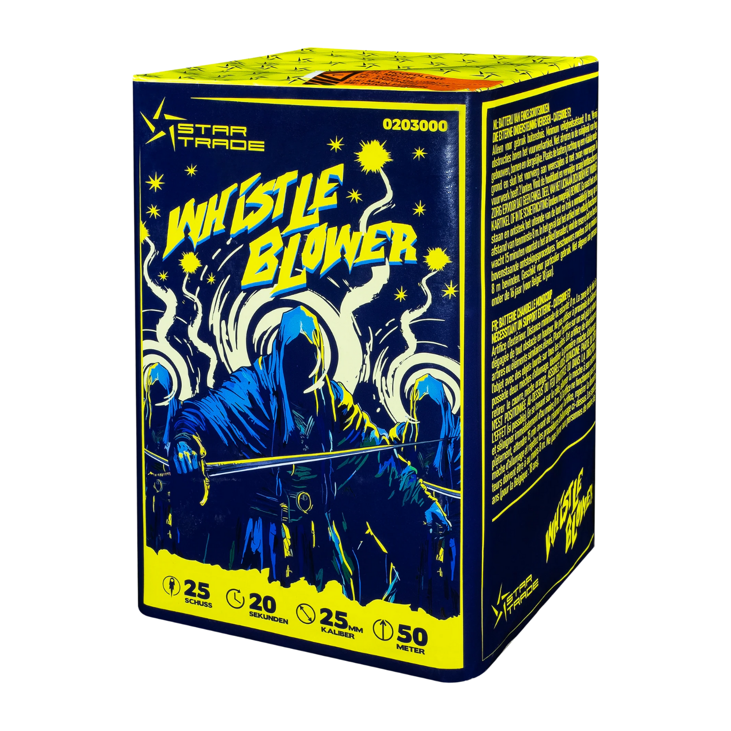 Die Whistleblower von Startrade macht ihrem Namen alle Ehre: Schrille, kreischend aufsteigende Wirbel-Effekte treffen auf kraftvolle Zerleger und große, farbintensive Blinker-Buketts. Jeder Schuss liefert einen markanten Mix aus Sound und Farbe und sorgt für auffällige laute Effekte, die zu Silvester sofort ins Auge fallen.