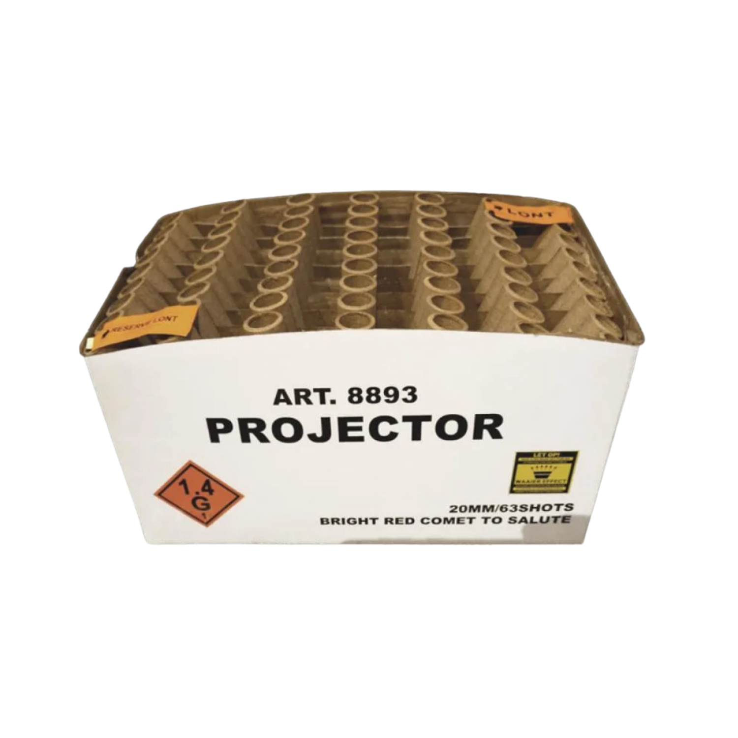 Die Wolff Vuurwerk Projector ist eine eindrucksvolle Salutfächerbatterie mit 63 rot aufsteigenden Strobe-Kometen, die in lautstarken Saluts explodieren. Diese Batterie liefert einen dynamischen, visuell kraftvollen Effekt, den Kunden besonders zu Silvester lieben.